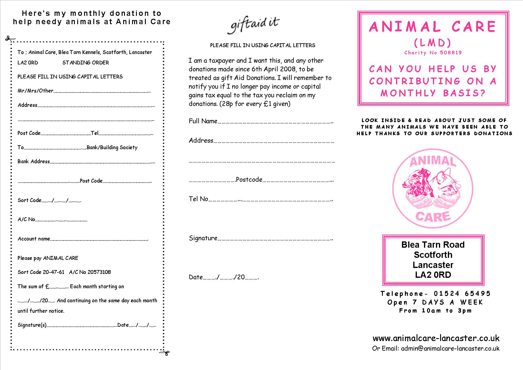 If you would like to give regularly by standing order, follow the link below, print out the form and send it back to us @ Animal Care, Blea Tarn Road, Scotforth, Lancaster, LA2 0RD